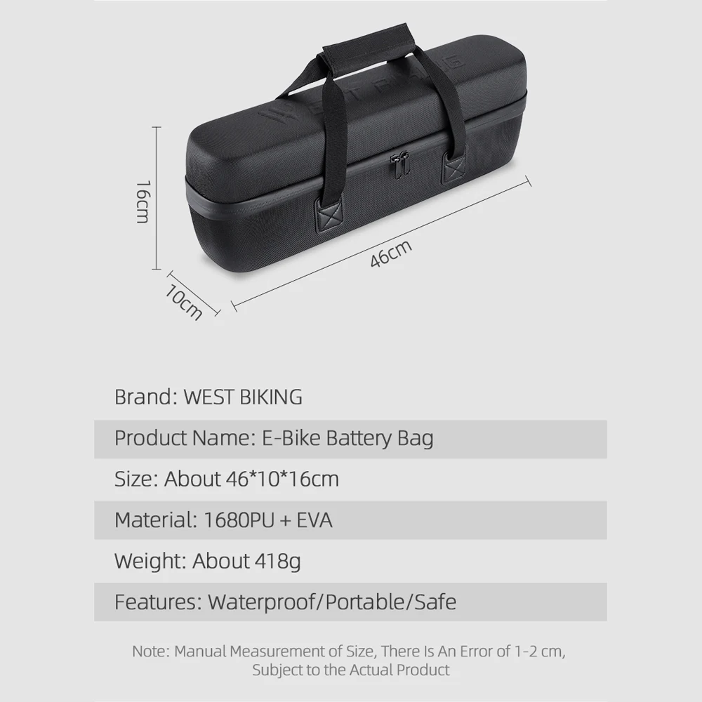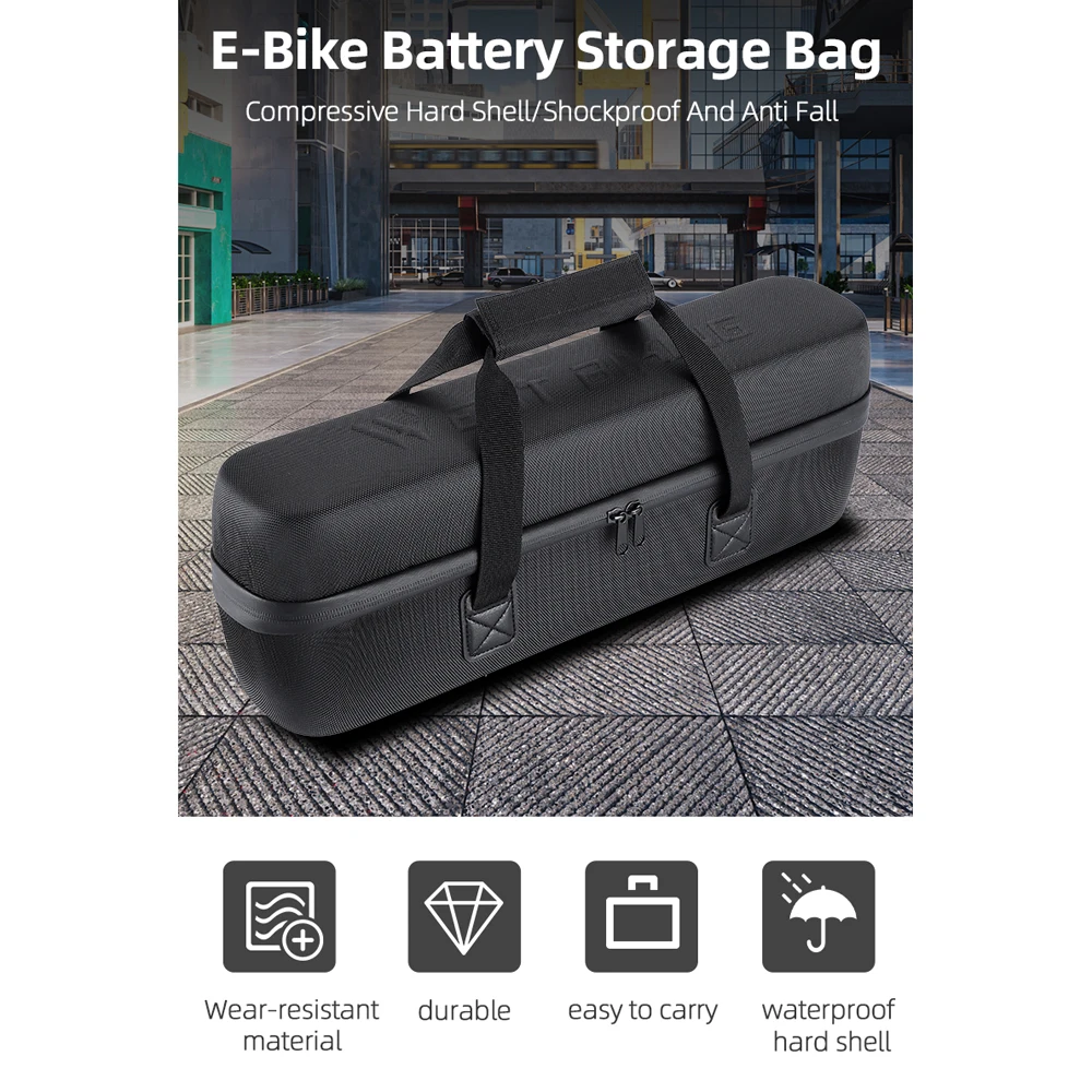 This is a hardshell electric bike battery storage bag, the ultimate solution for protecting and transporting your battery. With its waterproof design, this bag provides protections against the elements, ensuring your battery stays safer. Its compact size and convenient carrying handle make it easy to take with you wherever you go.