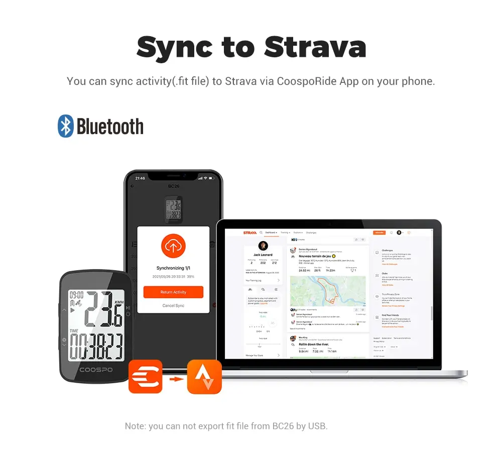 Sync Activity(.fit file) to Strava: You can also sync activity(.fit file) to Strava via Coosporide App on your phone by bluetooth directly.CooSpo bike computer can record 80 hours of your riding data.