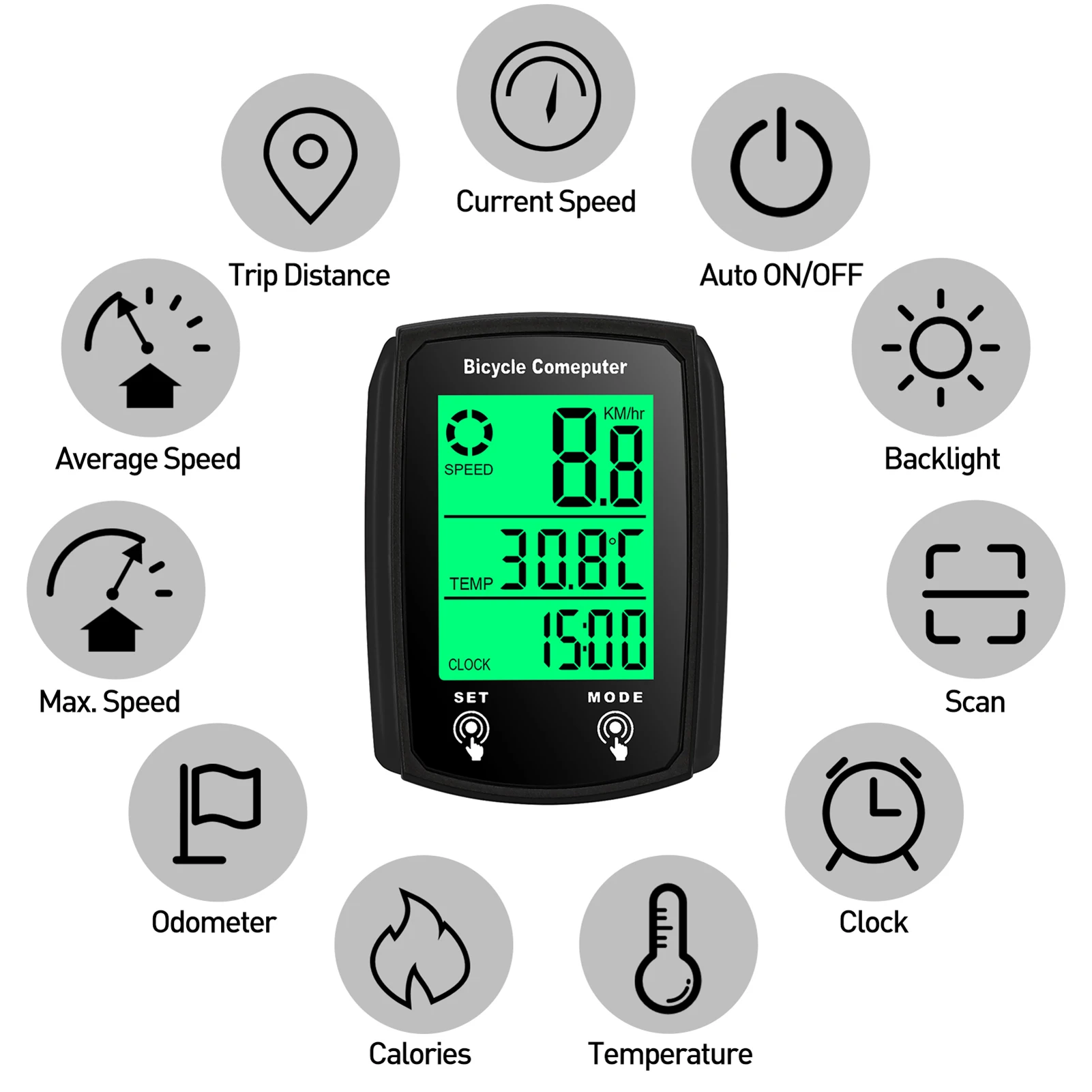 19 functions: current/max/average speed, odometer, trip distance, elapsed time, calories, temperature, scan, clock, and more.