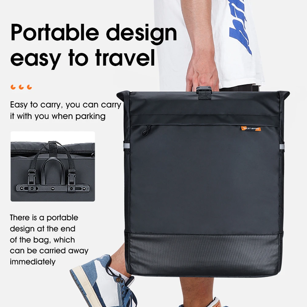This bike backpack uses premium PVC and polyester materials, soft, no fading, not easy to deform, not easy to wrinkle. 210D black encryption lining, wear-resistant and tear-resistant, with fine durability. The exterior has an oversized pocket, a large capacity of 30L and provides a lot of space for your items. Double-sided reflective strips design, high light reflection, riding at night is safer.